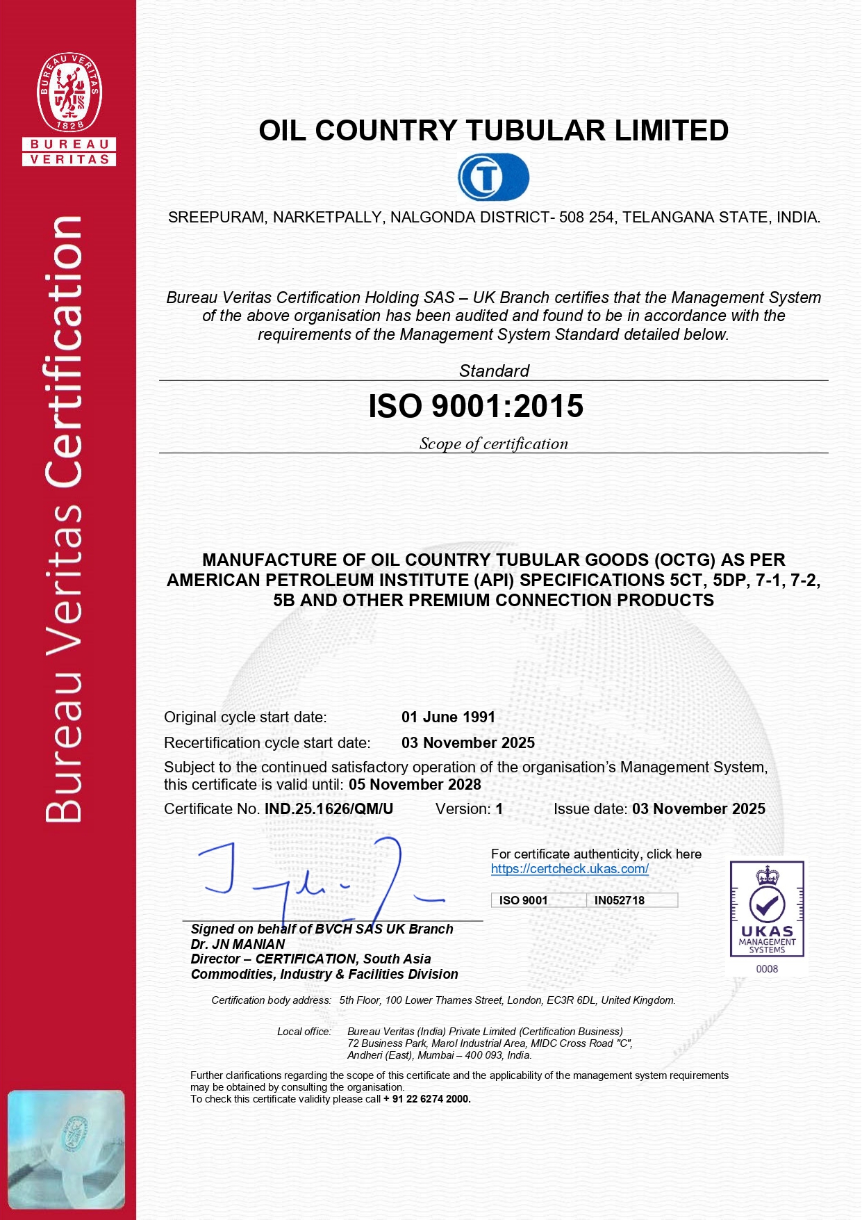 Oil Country Tubular Limited (OCTL), is a processor of a wide range of Oil Country Tubular Goods required for the Oil Drilling and Exploration Industry. OCTL is located near Hyderabad city, India, and is an unique facility in the World.